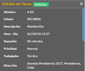 Al seleccionar una tarea de la lista de tareas o al presionar una tarea en el mapa, la información aparecerá en el recuadro inferior izquierdo.