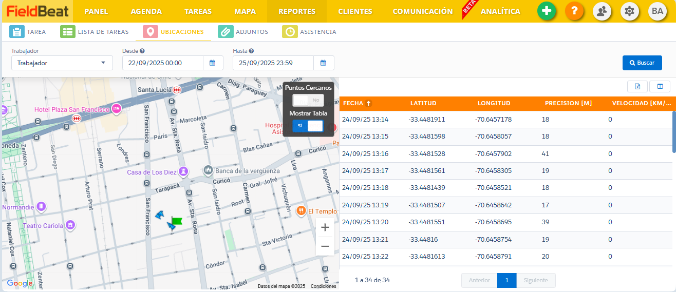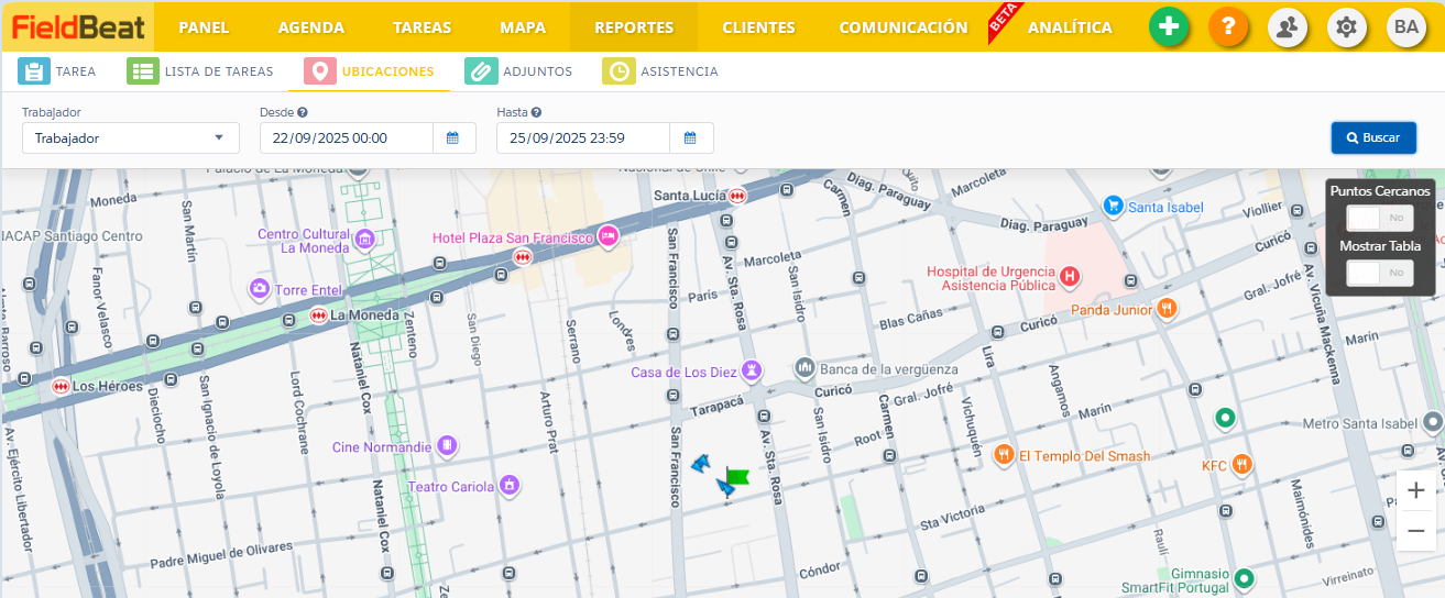 Una vez seleccionados los datos, el sistema arrojará un mapa indicando los puntos por donde transitó el trabajador, tal como se muestra en la siguiente imagen: