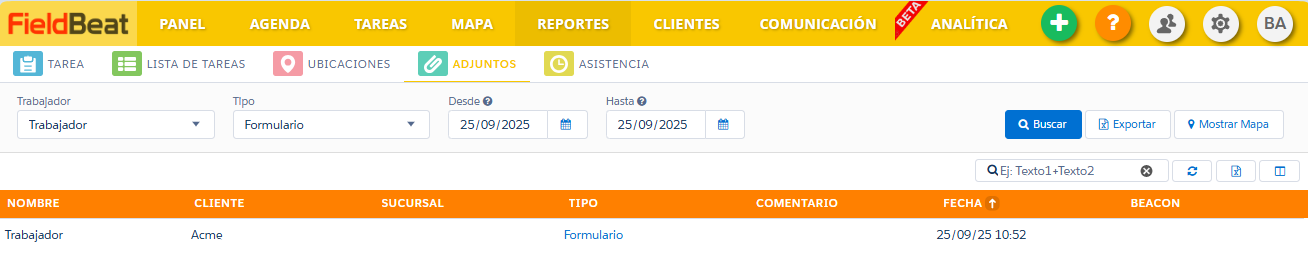 El reporte de adjuntos permite visualizar elementos enviados por el trabajador en forma individual, tales como fotografías, formularios, firmas y ubicaciones.