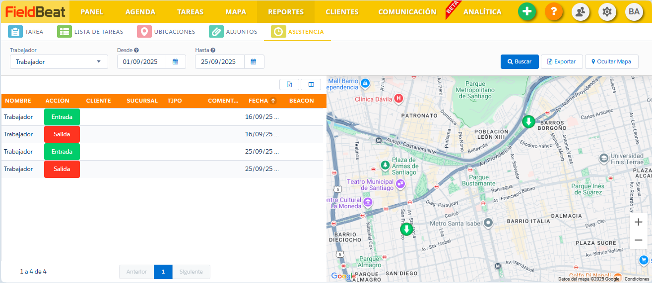 Se visualizará un mapa indicando los lugares donde se marcó la entrada y la salida. Además, se visualizará la lista de ingreso y salida con fecha y hora de cada uno de los trabajadores.