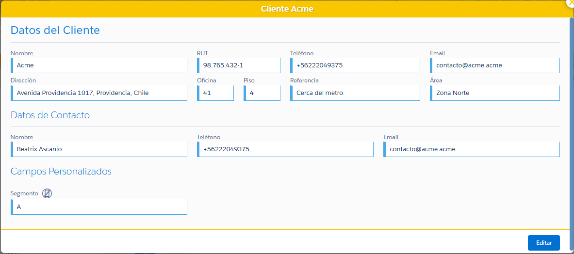 Al seleccionar un ítem de la tabla, se visualizará una ventana emergente con toda la información asociada a un cliente en particular.