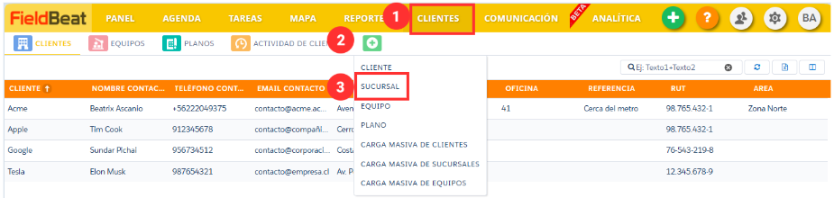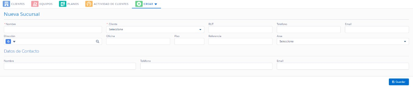 Paso 1: En Clientes presione la pestaña “Crear” y luego “Sucursal”: