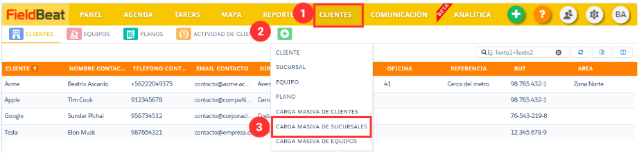Paso 1: En Clientes presione la pestaña “Crear” y luego “Carga Masiva de Sucursales”:
