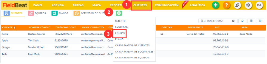 Paso1: En Clientes presione el botón con el símbolo (+) “Crear” y luego “Carga Masiva de Equipos”: