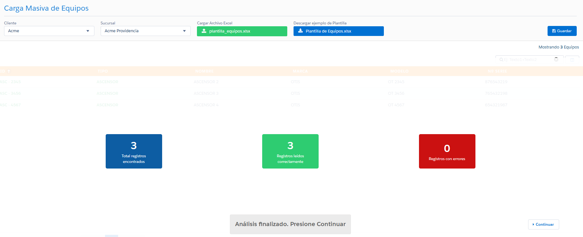 Paso 4: Una vez revisados todos los equipos, presionar Guardar y el sistema comenzará a crear todos los registros.
