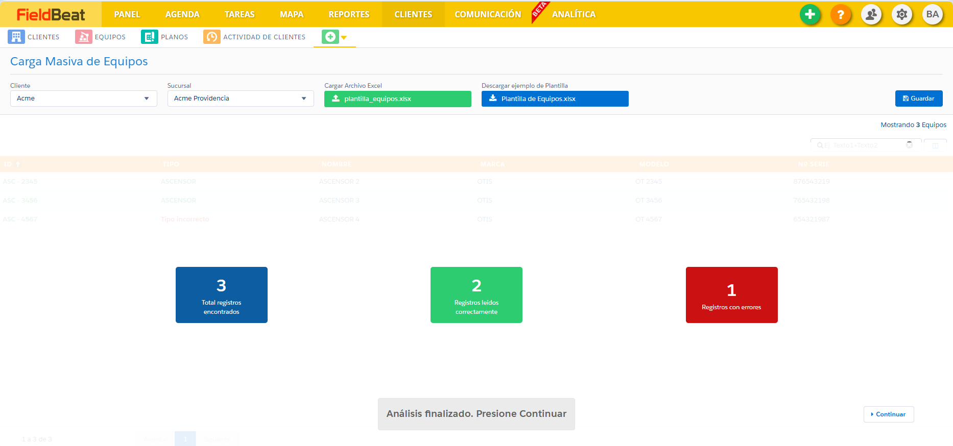 En caso de que la carga de equipos presente algún error se indicará en el modal los registros que deben ser corregidos.
