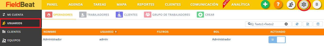 Paso 1: Ingresar a la plataforma web de FieldBeat, hacer click en el botón de configuración y luego ir a la sección de usuarios.