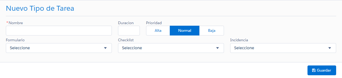 - Formulario (opcional): seleccionar un formulario por defecto para el tipo de tarea.
