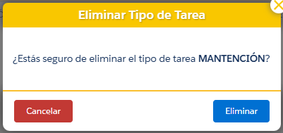 - Se va desplegar una advertencia, seleccionar Eliminar para borrar el tipo de tarea o Cancelar para mantenerlo.