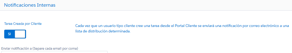 - Cada vez que un usuario tipo cliente cree una tarea desde el Portal Cliente se enviará una notificación por correo electrónico a una lista de distribución determinada.