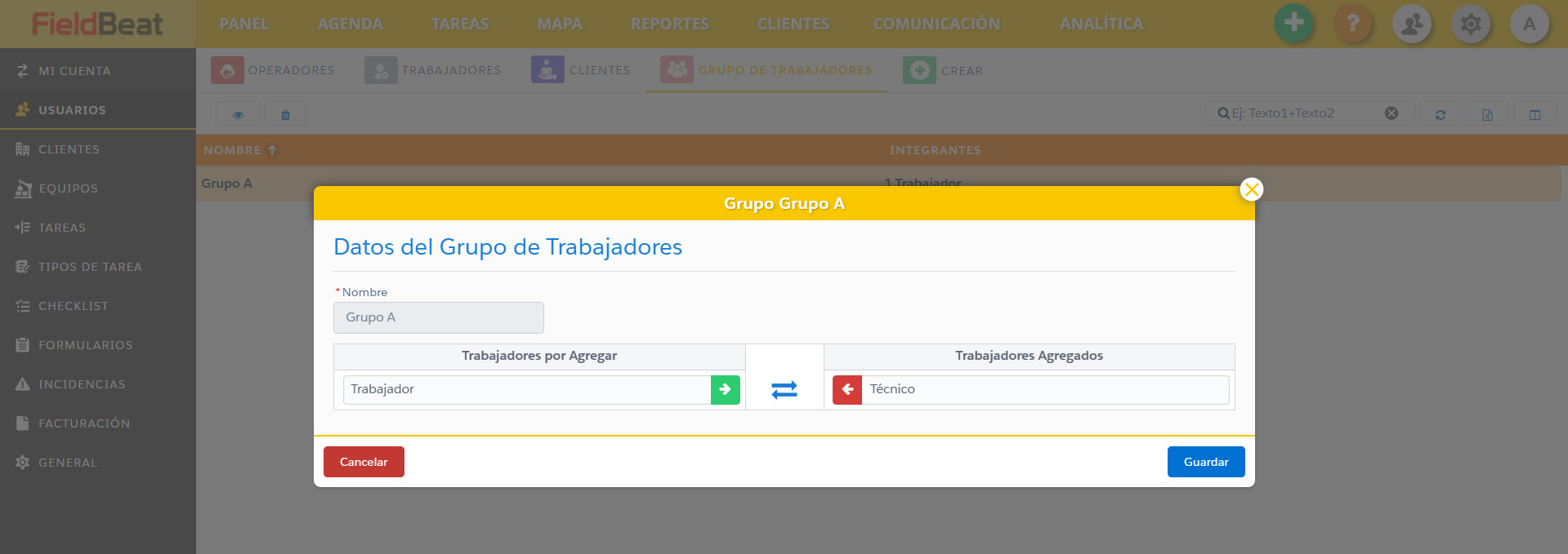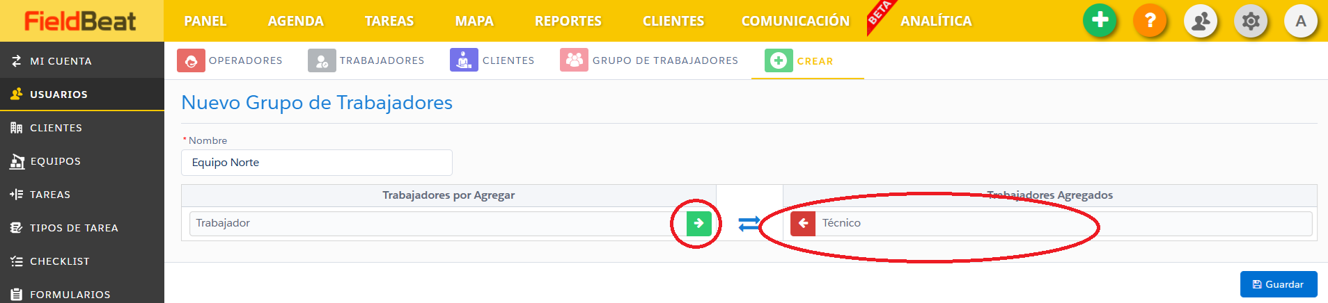 Paso 3 : Puede agregar o eliminar trabajadores del grupo presionando en la flecha verde.