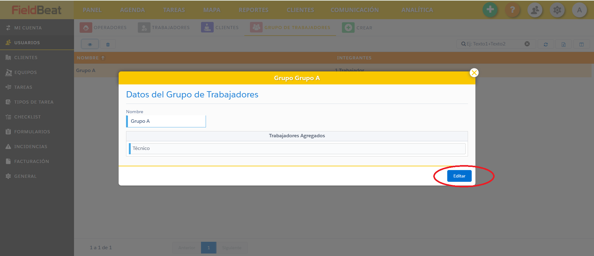 Para poder modificar un grupo de trabajadores debe seguir los siguientes pasos: