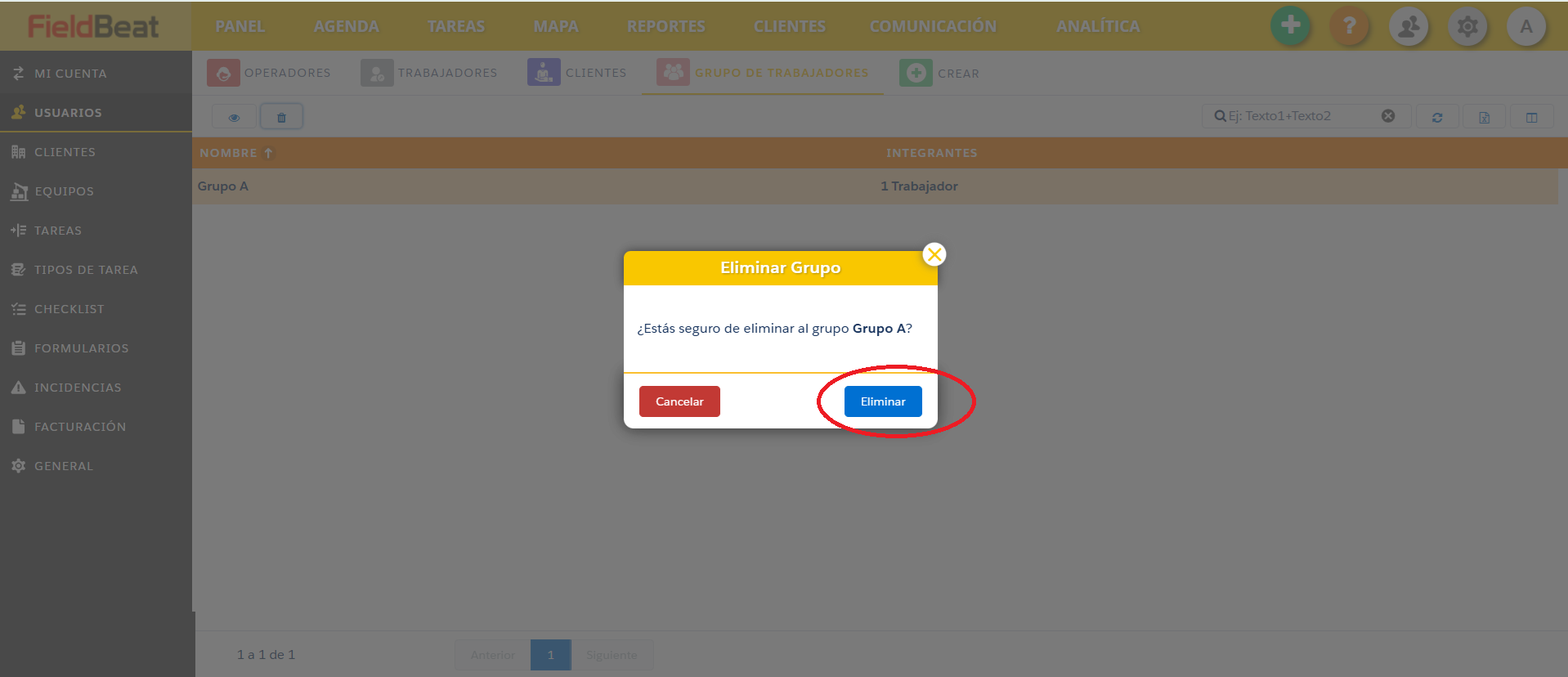 Para poder eliminar un grupo de trabajadores debe seguir los siguientes pasos: