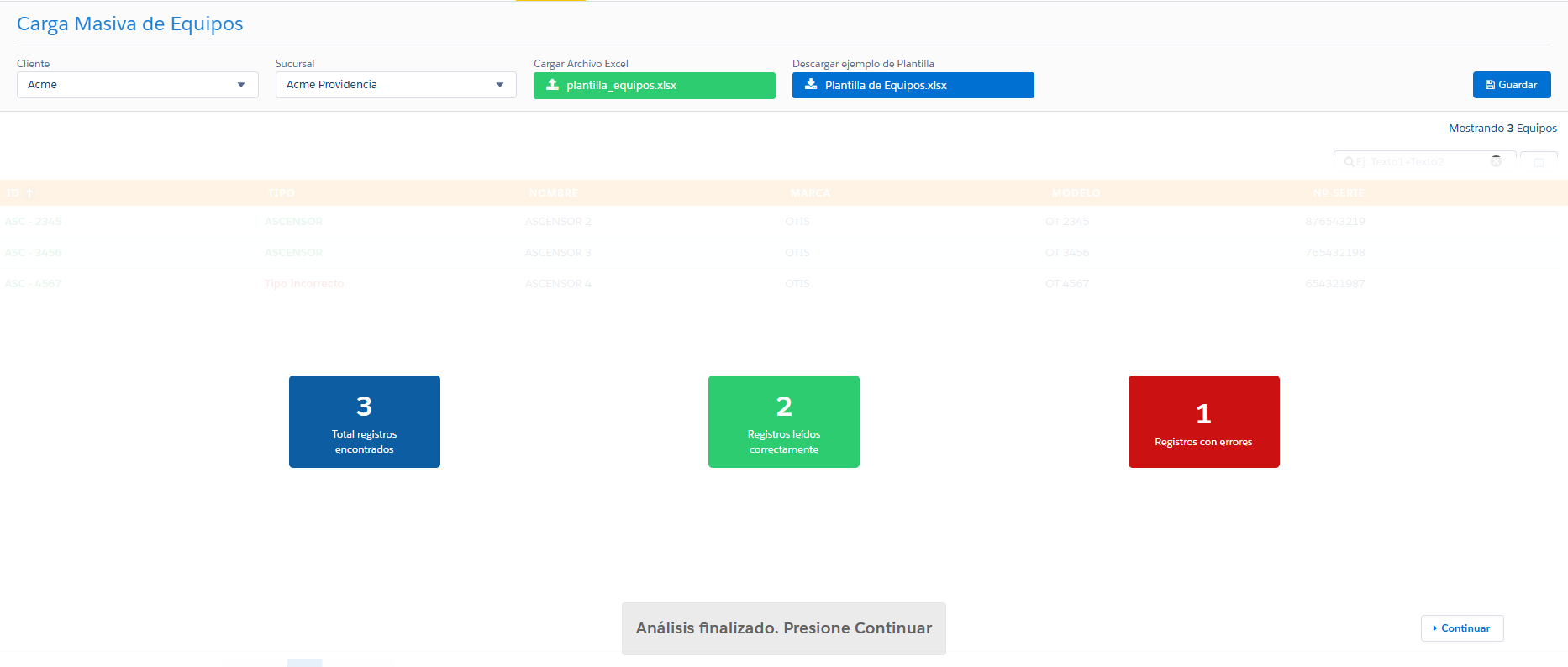 Paso 4: Una vez revisados todos los equipos, presionar Guardar y el sistema comenzará a crear todos los registros.