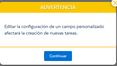 Importante: Los cambios realizados se llevarán a cabo sobre las nuevas tareas o las tareas pendientes de ejecutar que sean editadas posterior al cambio de los campos personalizados.