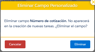 Importante: Los campos eliminados no aparecerán en las nuevas tareas creadas o las tareas pendientes de ejecutar que sean editadas posterior a la eliminación.