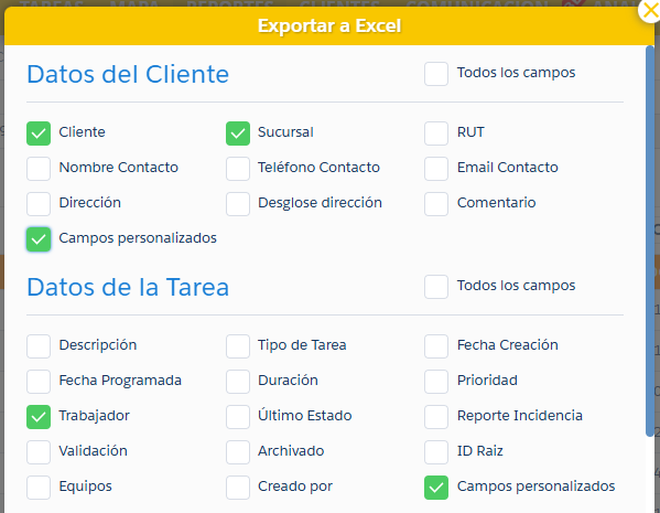 En la pestañas Reportes > Lista de Tareas podrá exportar a Excel toda la información de Campos Personalizados Tarea y Campos Personalizados Cliente, para lo que deberá: