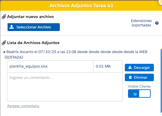 En el modal de los archivos adjuntos se pueden descargar, eliminar y permitir que sea visible en el reporte de la tarea que se envía al cliente.