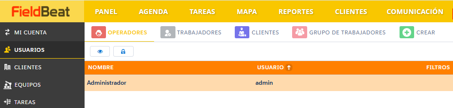Paso 1: Ingresar a la plataforma web de FieldBeat, hacer click en botón de configuración, luego ir a la sección de usuarios y seleccionar el usuario al que se desea cambiar la clave.