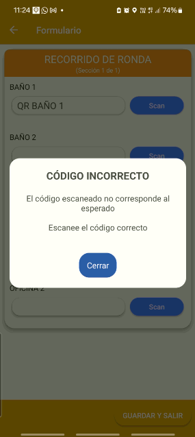 Si el trabajador intenta escanear un código que no corresponde, aparecerá un mensaje de alerta: