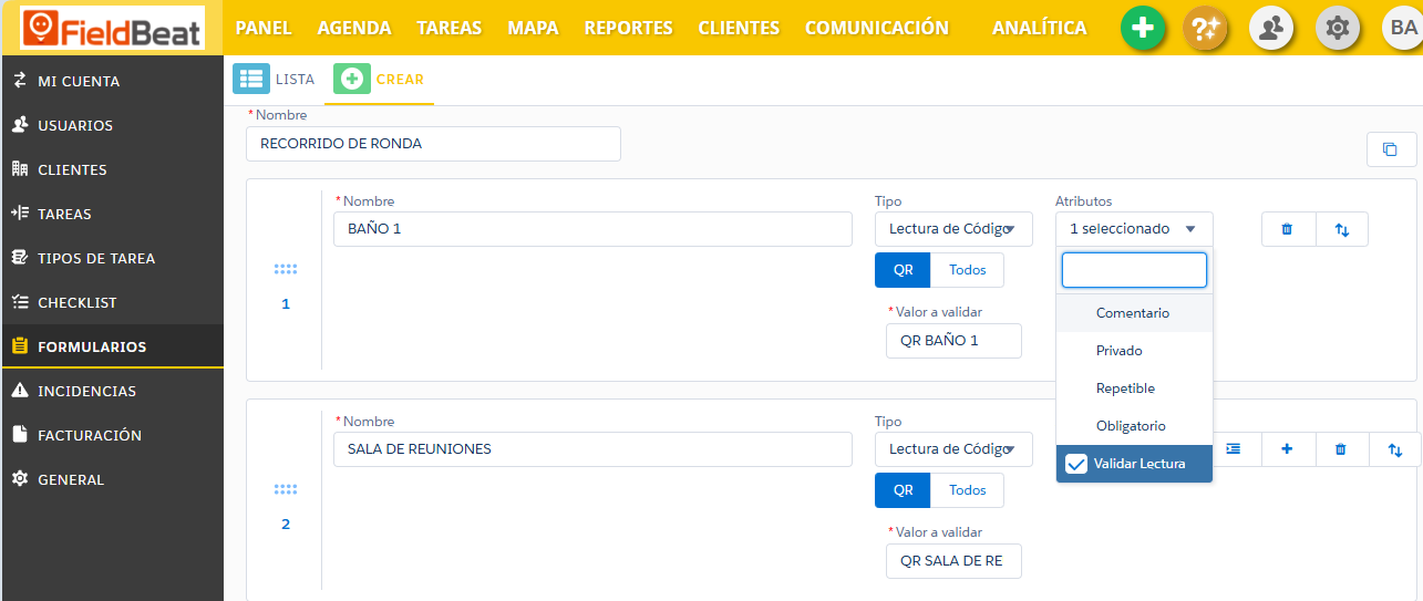 En el campo "Valor a validar", escribe el código exacto que esperas que el trabajador escanee (por ejemplo, el ID de una máquina o un sector).